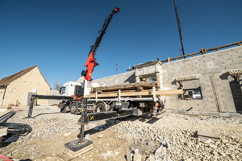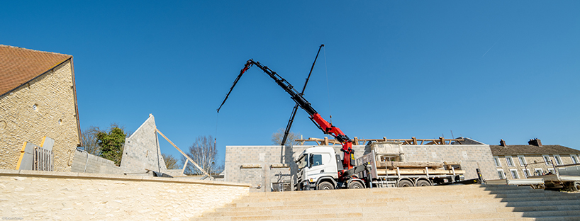 Le dernier projet en date de CHARPENTES PAYS DE BRAY, situé à Chambors, illustre parfaitement leur expertise. Ce chantier exceptionnel de par sa taille a nécessité le levage de 60 tonnes de charpente et 40 à 50 tonnes de couverture dans un rayon de 22 mètres. Grâce à l'utilisation de ses deux grues PALFINGER, l'équipe a pu mener à bien ce projet complexe alliant techniques traditionnels et modernité.